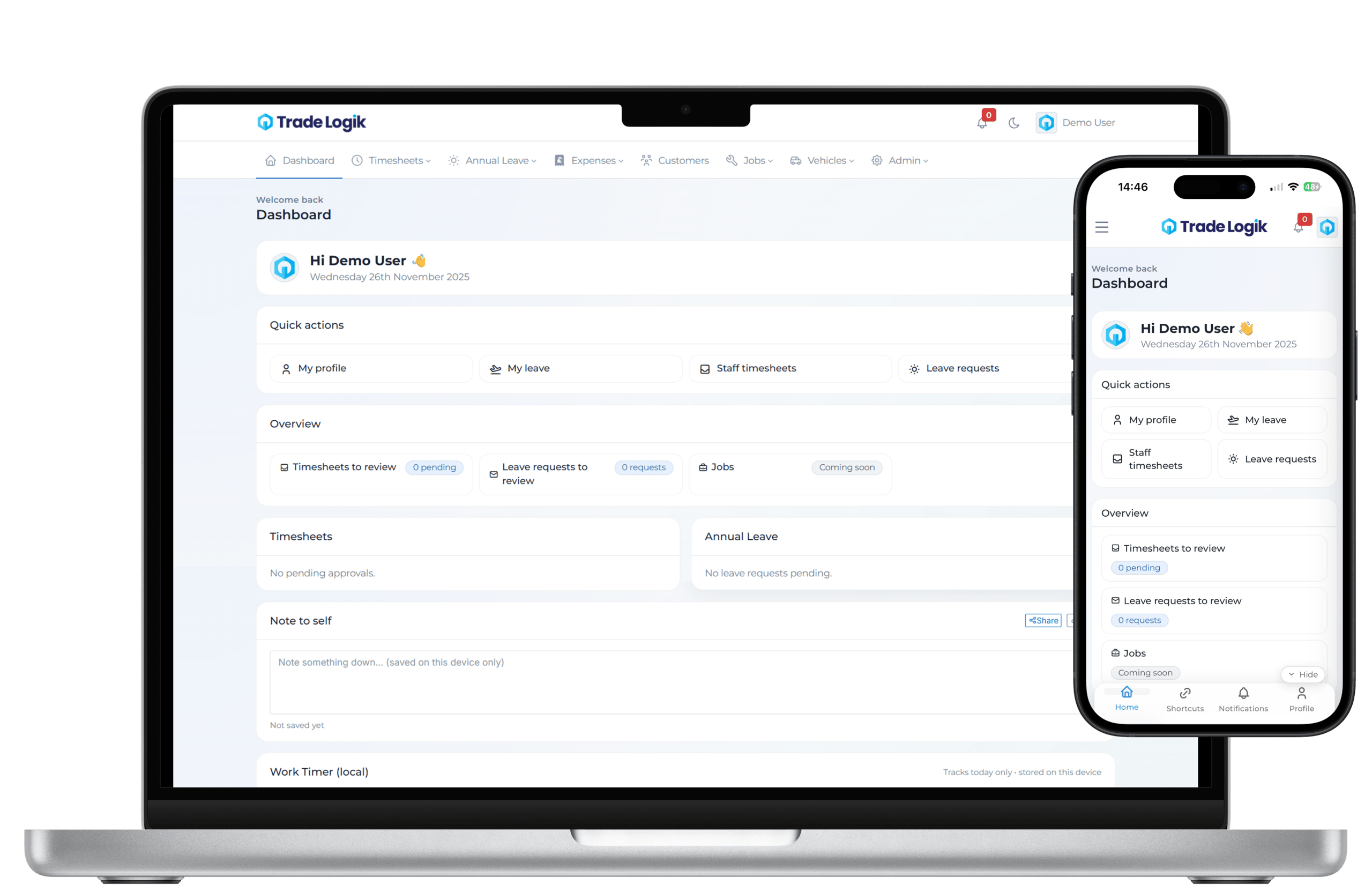 Trade Logik is a simple, powerful SaaS and PWA platform built for trade teams of all sizes. Whether you’re on-site, in the office, or on the road, our system works on any device — phone, tablet, laptop, or desktop. And with mobile push notifications, your team never misses an update.